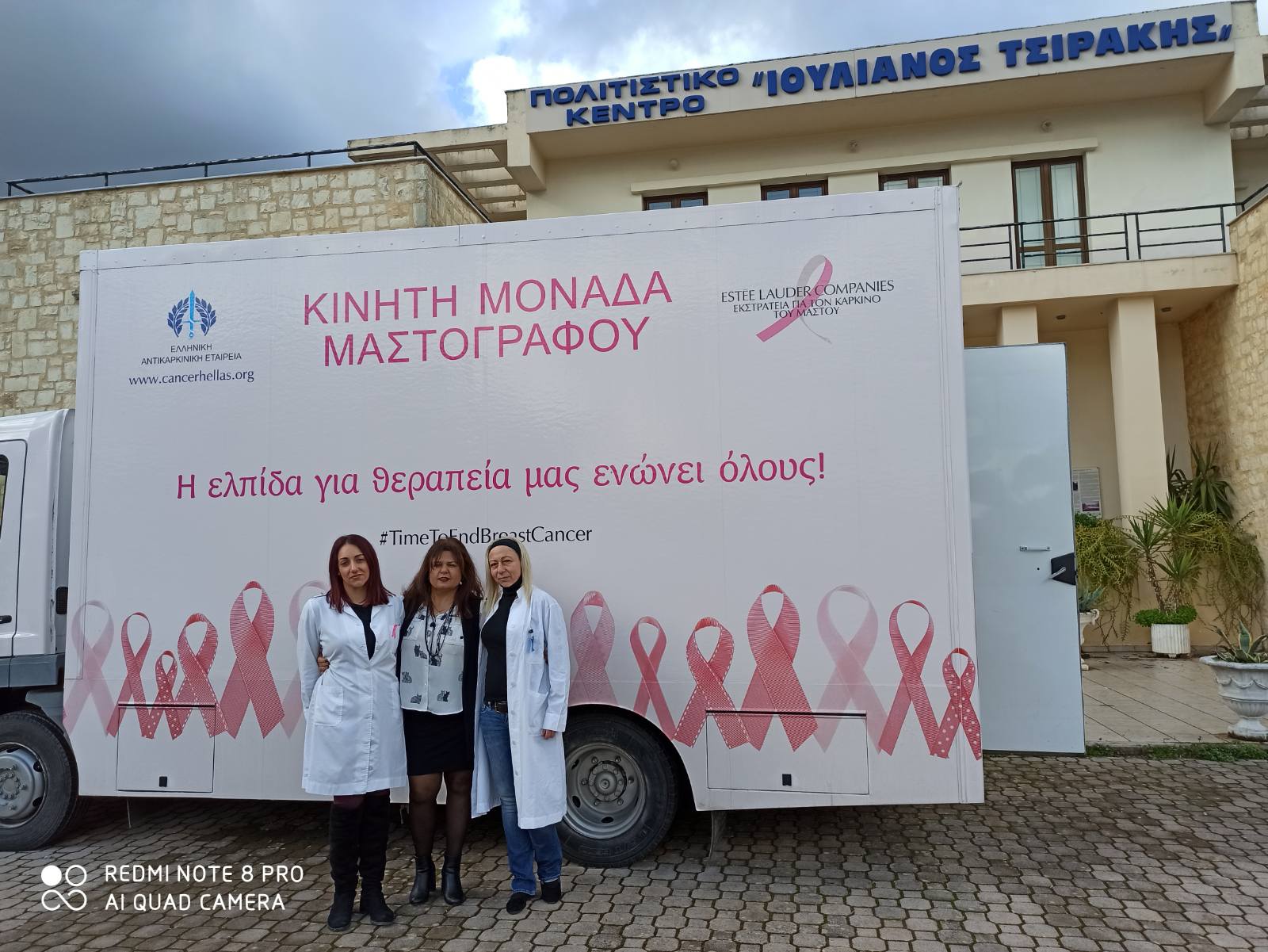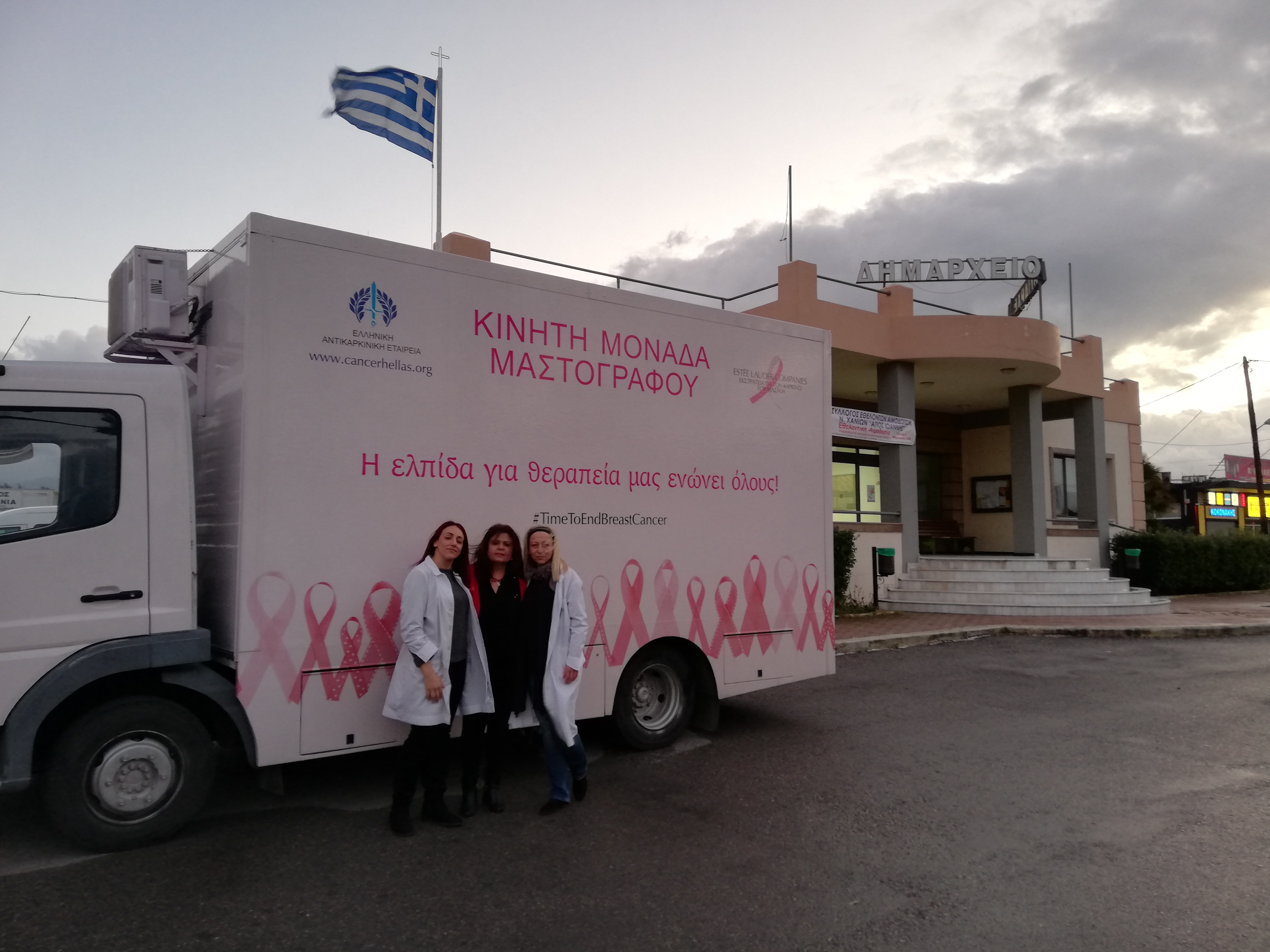 Συνολικά 100 γυναίκες υποβλήθηκαν σε δωρεάν μαστογραφικό έλεγχο, στην κινητή μονάδα μαστογράφου της Ελληνικής Αντικαρκινικής Εταιρίας, την Τρίτη 28 και την Τετάρτη 29 Ιανουαρίου στο Σκινέ (Τσιράκειο) και στο Δημαρχείο Πλατάνια στο Γεράνι.Η δράση, που είχε ως σκοπό την ευαισθητοποίηση και την έγκαιρη διάγνωση του καρκίνου του μαστού, πραγματοποιήθηκε μέσα από τη συνεργασία του Δήμου Πλατάνια με το Παράρτημα Χανίων της Ελληνικής Αντικαρκινικής Εταιρείας.