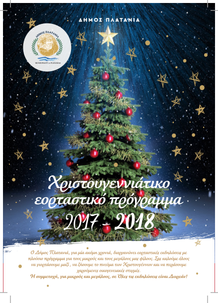 Ο Δήμος Πλατανιά, στο πλαίσιο των φετινών εορταστικών εκδηλώσεων του , διοργανώνει μια σειρά δράσεων με πλούσιο πρόγραμμα για μικρούς και μεγάλους .