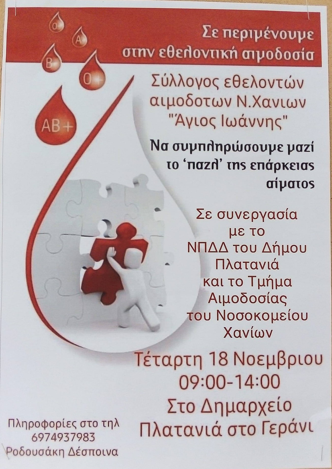 Το ΝΠΔΔ Δήμου Πλατανιά σε συνεργασία με το Σύλλογο Εθελοντών αιμοδοτών Ν. Χανίων” Αγιος Ιωάννης” και το τμήμα αιμοδοσίας του Νοσοκομείου Χανίων, διοργανώνει ΕΘΕΛΟΝΤΙΚΗ ΑΙΜΟΔΟΣΙΑ στις 18 Νοεμβρίου 2020,