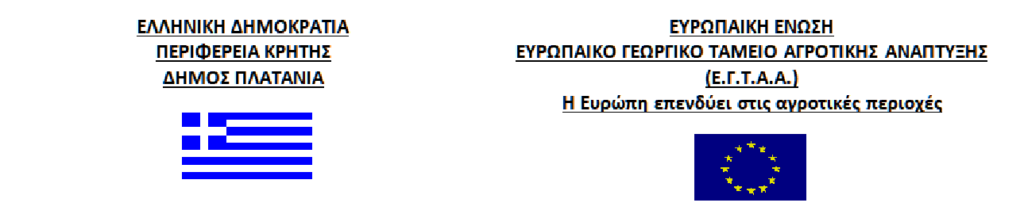 Το έργο χρηματοδοτείται από το ΠΡΟΓΡΑΜΜΑ ΑΓΡΟΤΙΚΗΣ ΑΝΑΠΤΥΞΗΣ (ΠΑΑ) 2014-2020 προσέγγιση CLLD LEADER” με την συγχρηματοδότηση του Ευρωπαϊκού Γεωργικού Ταμείου Αγροτικής Ανάπτυξης (ΕΓΤΑΑ) με κωδικό ΟΠΣΑΑ 0010962640 και πιστώσεις που προέρχονται από τη ΣΑ 082/1 του Προγράμματος Δημοσίων Επενδύσεων (ΠΔΕ). Ο Κωδικός ΣΑΕ του έργου είναι 2017ΣΕ08210000. Είναι εγγεγραμμένο στο Τεχνικό Πρόγραμμα και στον προϋπολογισμό του 2020 του Δήμου Πλατανιά σε βάρος του Κ.Α 64.7336.004. Προκαταβολή δύναται να χορηγηθεί.