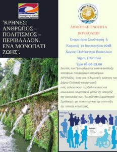 Την Κυριακή 21/1 η επόμενη συνάντηση φορέων & πολιτών της Δ.Ε Βουκολιών στο πλαίσιο της πρωτοβουλίας «Κρήνες: Ένα Πολιτιστικό-Κοινωνικό και Περιβαλλοντικό Μονοπάτι Ζωής» που υλοποιεί ο Δήμος Πλατανιά & η Ε.Δ.Ε.Ε.Κ